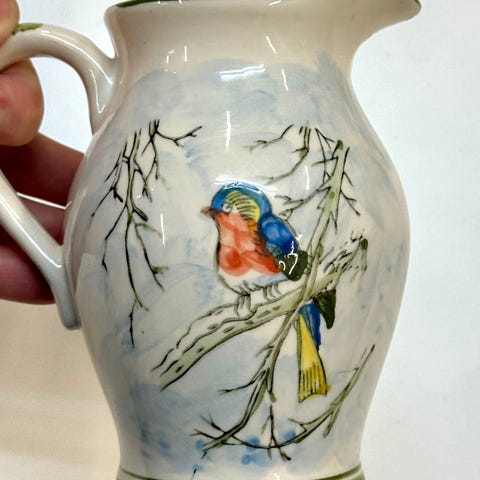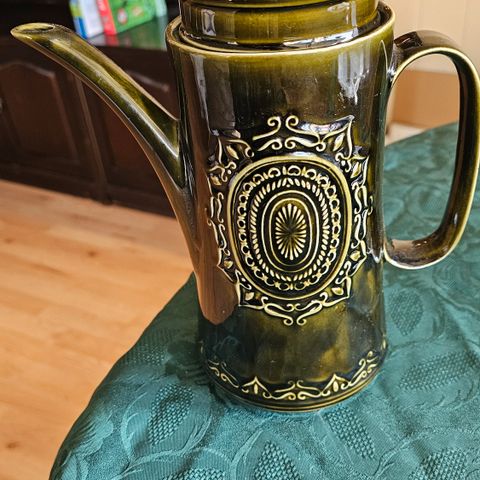 vintage kanne, keramikkmugge, melkekanne, fløtemugge, retro kjøkken, håndmalt keramikk, kjøkkeninteriør, liten mugge