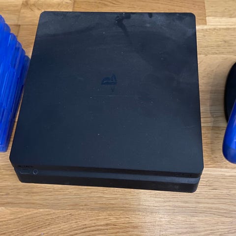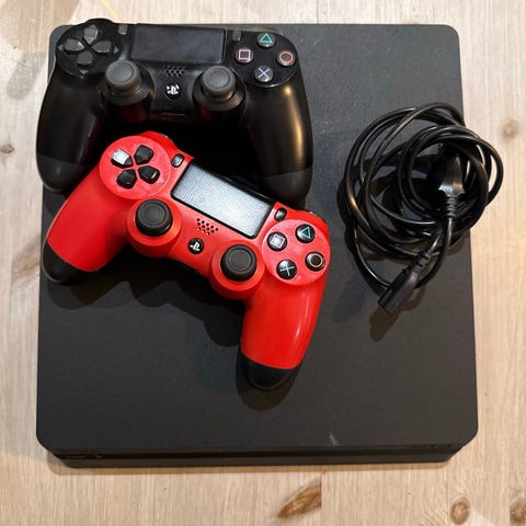 Sony Playstation 4 spillkonsoll med kontroller. Konsollen har et svart design og er beregnet for bruk med Playstation 4-spill.