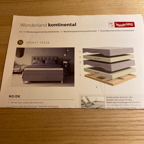 Lite brukt kontinentalseng i tre deler selges. Stått på gjesterom. Følger også med en godt brukt svane overmadrass. Den originale overmadrassen er ikke ligget på da det er brukt ekstra overmadrass. Svane madrass kan da f.eks legges under original overmadrass og gi ekstra komfort.