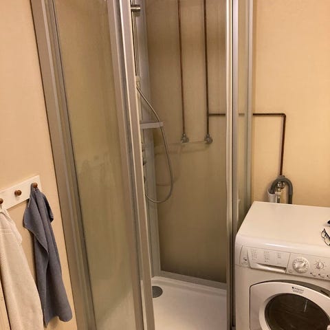 Dusjhjørne med dusjvegg og dusjforheng