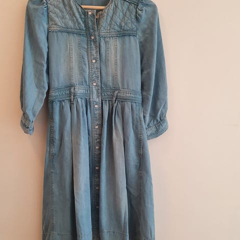Nydelig kjole i str 36. Fint snitt som gir en slankende effekt. Midtstykket på kjolen er mørk blå, armer og sidestykker er svart.