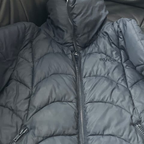 Jean Paul Annet yttertøy dunjakke i størrelse M/ L for dame. Jakken er svart og laget av dun, egnet som yttertøy for kaldere vær. Den har hette og to lommer foran.