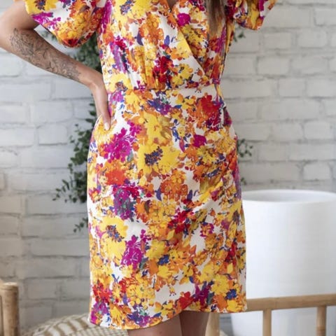 YAS Langermet Kjole i størrelse L, med svart bakgrunn og oransje blomsterprint. Kjolen har en krage, knappelukking foran og elastiske mansjetter. Bilder lånt fra nett.