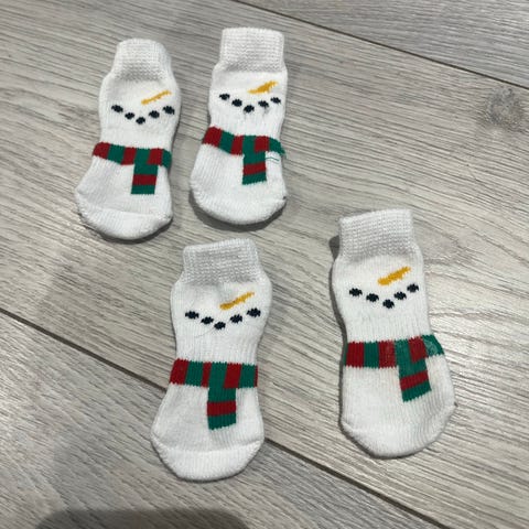 5 sett med potesokker til hund med julemotiv selges samlet for 80 kr. De har en lengde på 7-10 cm og en bredde på 3-4 cm, men er tøyelige og kan derfor passe til større poter også.