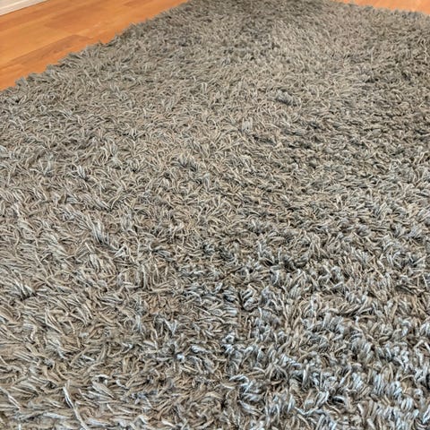 Mykt og behagelig teppe med relativt lang lugg (5 cm), i nøytral grå farge som passer de fleste rom.