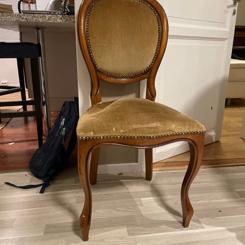 Kjøpt på Finn, men de passet ikke så godt inn hos oss og de var dessverre i dårligere stand enn vi trodde. Trenger en kjærlig hånd! De er ellers hele og fullt mulig å sitte på. De har noen flekker av maling og noen ujevnheter. Se bilder.