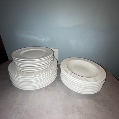 IKEA tallerken sett bestående av to porselensfat i hvit farge. Settet inkluderer et større og et mindre fat med oval form. Egnet for servering og presentasjon av mat.