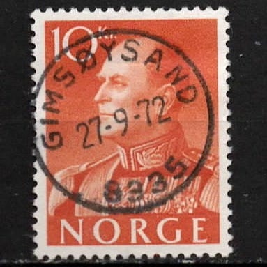 Norge frimerke med verdi 5 kr. Farge lilla. Motiv av portrett av en Kong Olav Vi uniform. Stempelmerke brukt til post. Sndes som vanlig post (billigst)