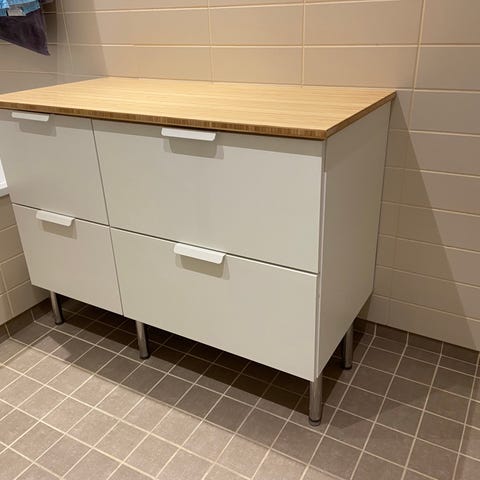 Hvit matt servant med to skuffer nederst. Matt sort ramme, 104cm bredde.