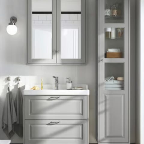 Høgskap til baderom i hvit farge med flere hyller. Skapet har en enkel design med to dører og er egnet for bruk på bad.