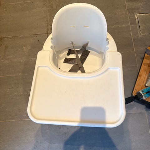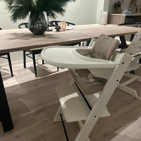 Stokke Baby set i fargen hazygrey med grå avtagbar pute i lys farge. Puten på sittedelen har en rift, men kan sys sammen