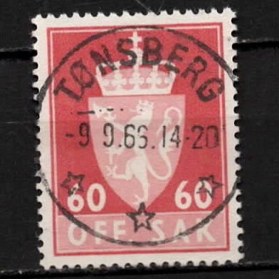 Norsk frimerke utgitt i 1964 med pålydende verdi 50 øre. Frimerket har rødt bakgrunnsfarge og motiv av Norges riksvåpen. Stempelmerke med poststempel fra Jessheim, datert 26. februar 1964.