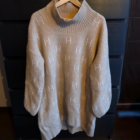 HÉST genser i størrelse M for dame, laget av merinoull. Genseren har en beige farge og et unikt mønster.