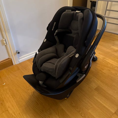 Maxi-Cosi Pebble 360 bilsete til baby med kapasitet for barn opptil 13 kg. Family fix base som passer til. Setet har roterende funksjon for enklere inn- og utstigning. Følger med nyfødt-innlegg. En plastikkbit er løs, se bilde, har ingen praktisk betydning. Må hentes på Østerås