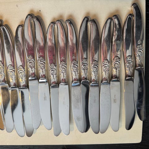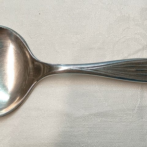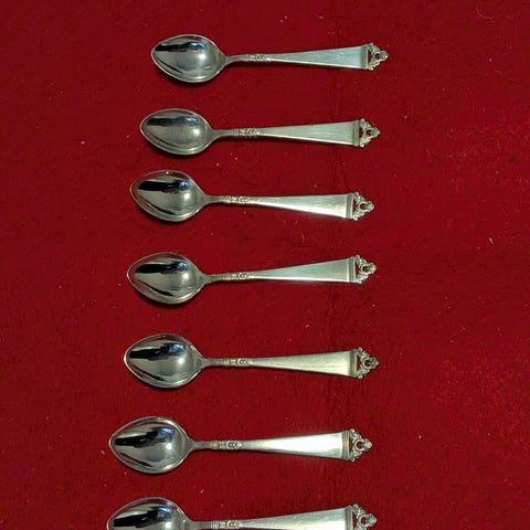 6 antikke sølvskjeer merket «T.H.B.E 830S» selges.