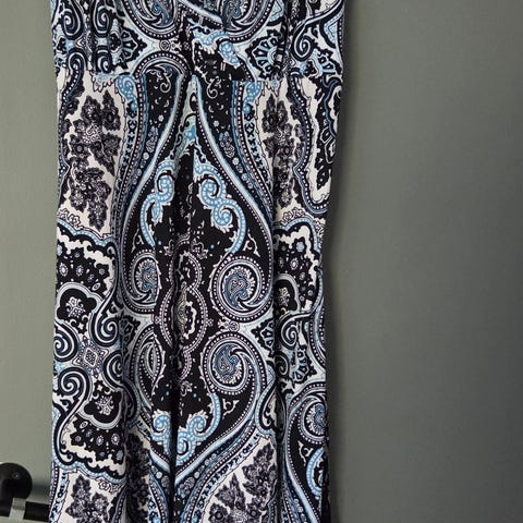 Denne komfortable sommerkjolen er i hvite og blå striper og består av 79% polyester, 18% viskose og 3% elastan. Den har hette med snøring og er veldig behagelig på. Det er god stretch i kjolen.