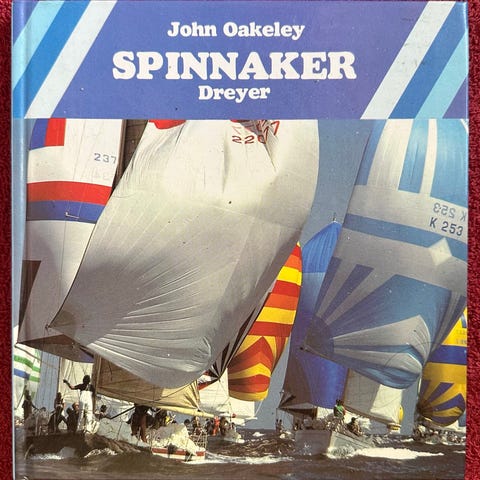 John Oakley Spinnaker Dreyer bok om seiling med spinnakere. Boken inneholder informasjon om lagring, start, seiling og mer, samt illustrasjoner og forklaringer på spinnakere og seilingsteknikker.