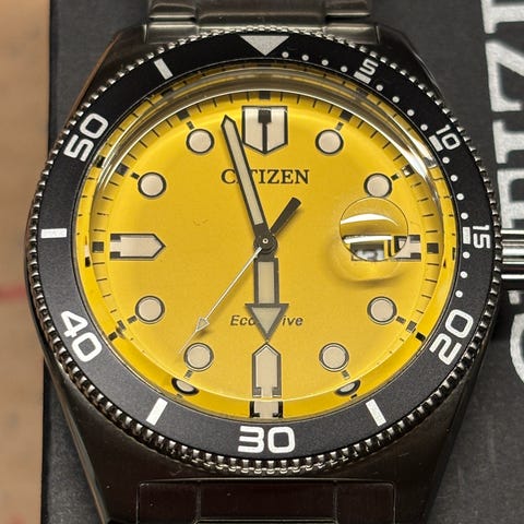 Den strålende gule urskive med sitt bølgende mønster skaper et dynamisk midtpunkt som fanger lyset fra enhver vinkel. Den sorte aluminiumsbezel og de kraftige luminova-markerte timeindeksene skaper en perfekt kontrast til den livlige urskiven. Den robuste 41.5mm urkassen i børstet rustfritt stål og den integrerte stållenken sikrer en solid konstruksjon.