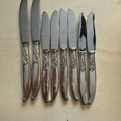 Mylius sølvkniver med dekorasjon på håndtaket. Har 15stk.