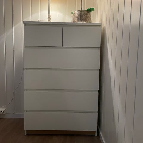 Selger en praktisk og romslig kommode med søte blå og hvite porselen knotter.