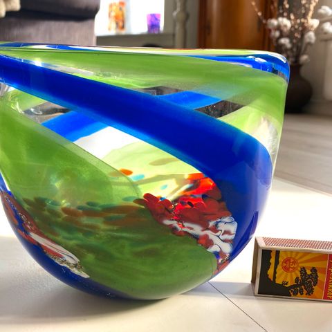Stor, lekker vase fra glassverk. Den har god vekt, oval form et frodig sort lilla, og rødt mønster med innslag av gult. Helt feilfri og aldri brukt. Høyde:24 cm. Øvre åpning: 18x10 cm. Vekt:3,6kg. Kan sendes, og pakkes godt. Kr.550