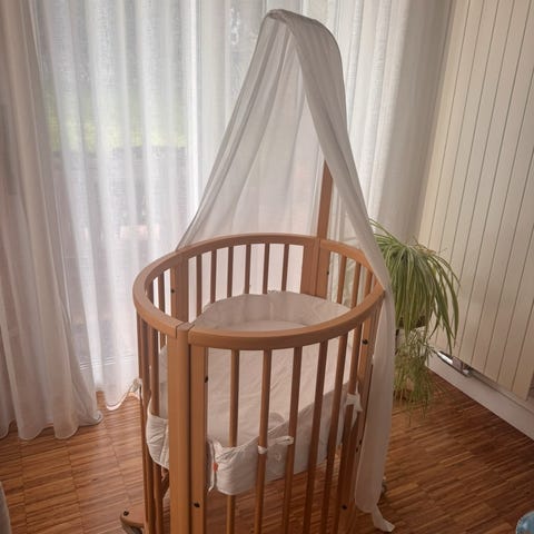 Vi selger vår hvitvasket Stokke Mini + Stokke Sleepi sprinkelseng.
