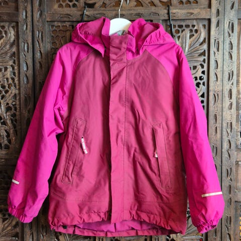 Bergans jakke for barn i størrelse 122, tilpasset jente. Jakken er laget av polyester og har en rød farge. Den har glidelås foran og lommer med glidelås, egnet for utendørs bruk.