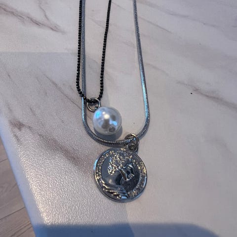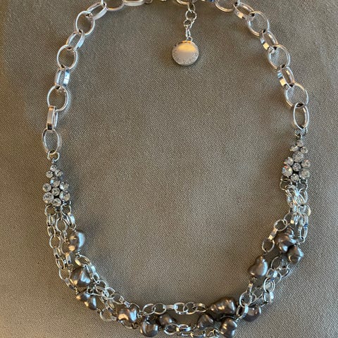 Pent kjede med anheng . Sort kjede med anheng formet som blad ( noe «bling»glans i anhenget , se bildet ) Lengde på kjedet er 80 cm , lengde på anheng 7cm , på det bredeste 3 cm . Lite brukt .