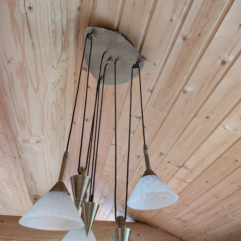 Taklampe med 5 glasskupler selges med 5 halogenpærer.
