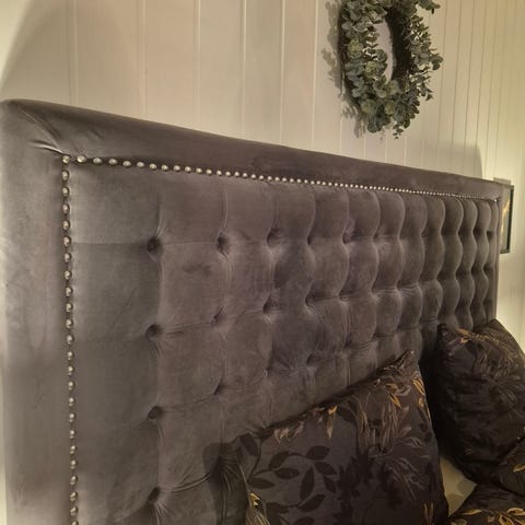 Flott sengegavl til 180 seng med burgunder pusestoff og nagler i krom selges