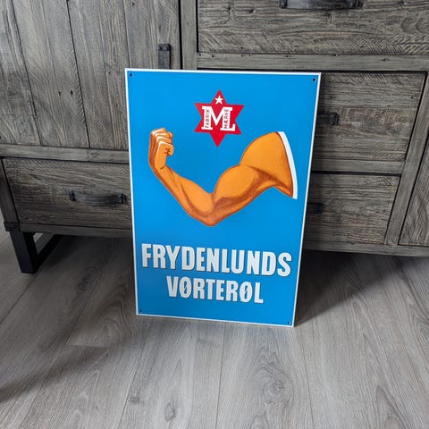 Det er et reklameskilt for Frydenlunds bryggeri, som reklamerer for øl.