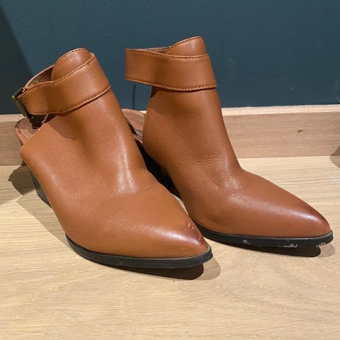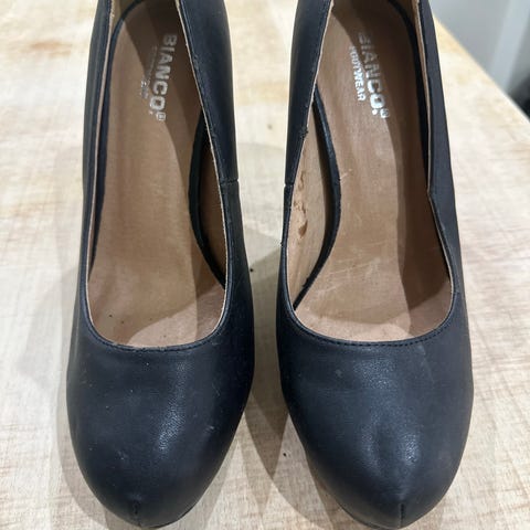 Bianco Hæler i størrelse 36 myk ekte skinn. Store i størrelsen. Skoene har kilehæl med trestruktur på yttersålen.