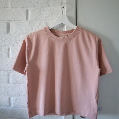 Veldig deilig rustrød ribbet t-skjorte i strl S fra Gina Tricot. Vaskelappen har blitt klippet av, men jeg er ganske sikker på at materialet den er laget av er viskose.