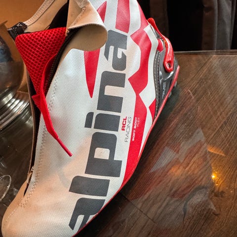 Alpina Racing skisko i rød og hvit farge. Skisko med glidelås foran og gummisåle med knotter for godt. Som ny.