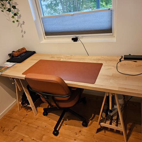 - Hvit bordplate – stor arbeidsflate til PC/monitorer, skrivearbeid mm