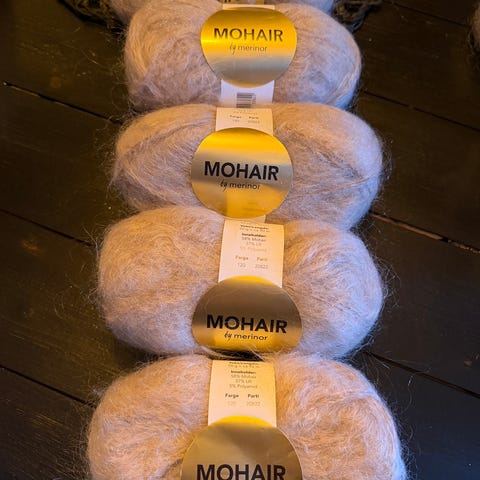 Mohair by Merinor selges samlet for 250,- eller 75,- pr nøste.