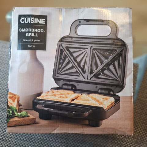 Elektrisk grill for tilberedning av hamburgere. Produktet leveres i originalemballasje med tilbehør og bruksanvisning.