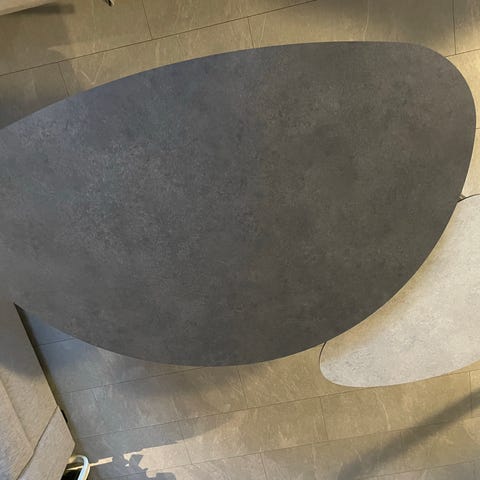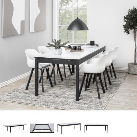 Spisebord med eikeplate, ileggsplate på 46 cm følger med (total bordlengde blir 216cm), bomullsfargede bordbein. Bordplate trenger å oljes.