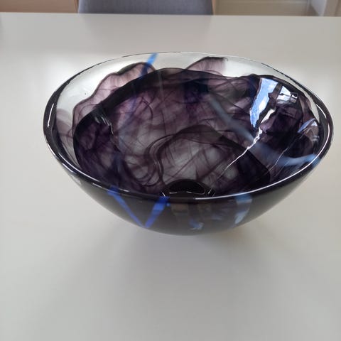 Veldig fint sett med vase og fruktfat selges, se bilder for mål. Fargen er litt lmørk lilla/ brun. Veldig fin uten å være " glorete". Stått til pynt ubrukte for det meste. Kosta 3000+ pr del for 10-15 år siden. Vase delen er signert under. Samleobjekt