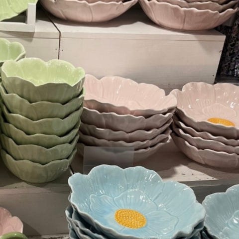 Vakker gulfarge, kommer ikke fram så fint på bildet. Pent brukt, Kr. 250,- pr. stk. Oyster skål 18x16 cm. 6 stk. i gul. En i lilla. Basic skål 19 cm har 11 stk. lilla er solgt.