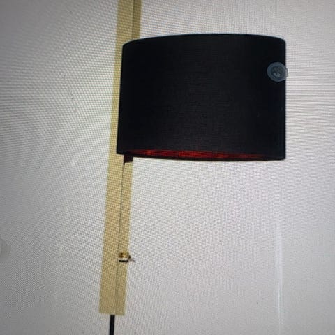 En vegglampe i metall med regulerbar arm og skjerm i plissert tekstil. Ledning med plastbryter. Passer til lyspære med E27-sokkel. Maks 8 W LED. Lyspære medfølger ikke. Lengde ca. 95 cm. Skjermens diameter 29 cm. Skjermens høyde 17 cm. Ledningslengde 250 cm.