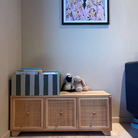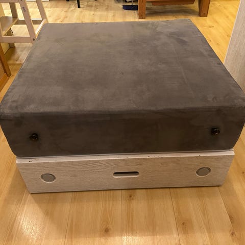 Oppbevaringsmøbel med tre hyller og benk. Perfekt høyde for barn å pusle, leke etc. Kan brukes med bokset i hyllene eller for bøker mm. Går på hjul så kan trilles rundt ved behov.