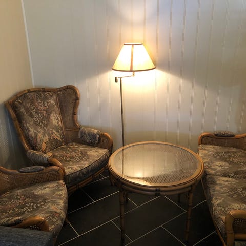 Selger en klassisk og koselig sittegruppe bestående av to komfortable lenestoler og ett matchende bord. Møblene har et tidløst design med blomstrete trekk og detaljer i tre, som gir et elegant og lunt uttrykk – perfekt til stue, gang, vinterhage eller hytte.