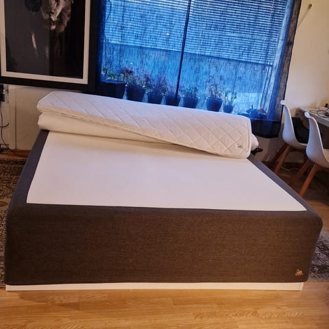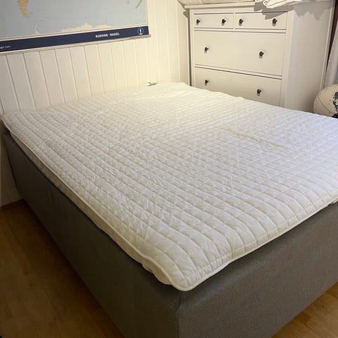 Svane seng med 4 madrasser som kan vendes på for å skifte fasthet. Med nesten ny overmadrass Premium Pulse Latex fra Wonderland. Sengen er i størrelse 180x200. Det er en ramme i bunn for å holde madrassene på plass.