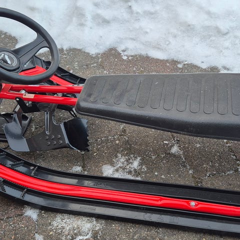 Leies ut: Stiga kjelke med ratt og bremser for mindre barn intill 8 år. 120 kr per dag. To barn får plass eller 1 barn og 1 voksen.