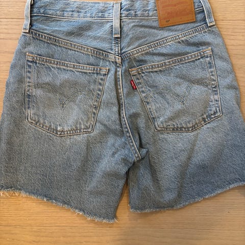 Levi's Denim shorts i svart farge, størrelse 24. Laget av denim materiale, designet for kvinner. Shortsene har knappelukking og klassiske lommer.