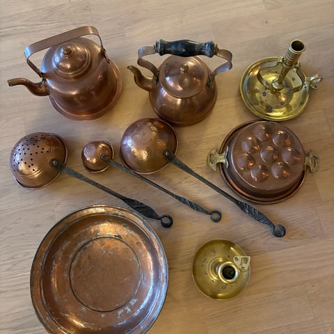 Selger en samling dekorative og funksjonelle gjenstander i kobber, messing og tre. Dette sto igjen da vi kjøpte hytte, og passer perfekt til hytte, landlig stil eller som dekor i hjemmet.