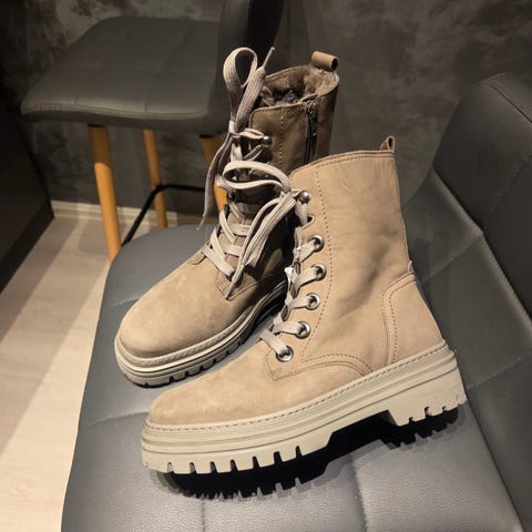 Helt nye. Kun prøvd på og impregnert. Ble litt for trang for meg. Små i str. bruker vanligvis 38.