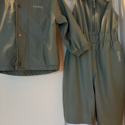 Kuling Outdoor barneklær i størrelse 90, fargen svart, designet for unisex barn. Settet inkluderer jakke med hette og bukse med elastisk midje og beinavslutning. Jakken og buksa har fleecefôr for ekstra varme. Selges samlet og kan sendes.