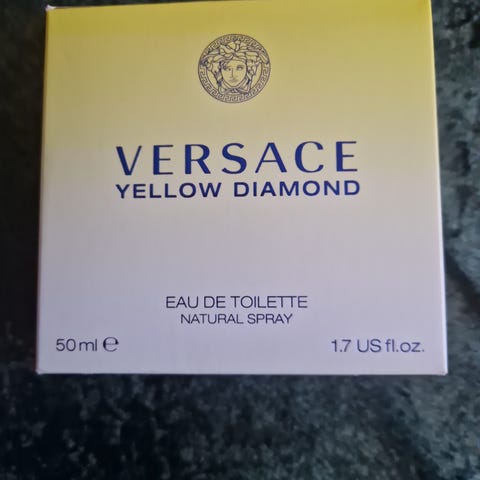 Versace Yellow Diamond Eau de Toilette med en volum på 50 ml. Produktet er pakket i en eske med et mønster som minner om slangeskinn.